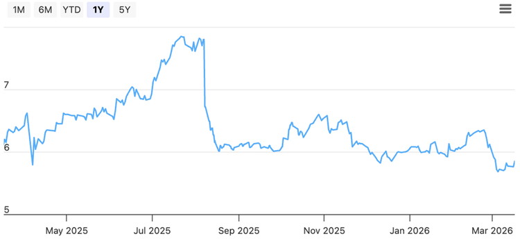 基于2026年3月13日约0.665新元的股价,这意味着过去12个月的股息收益率约为6.0%。