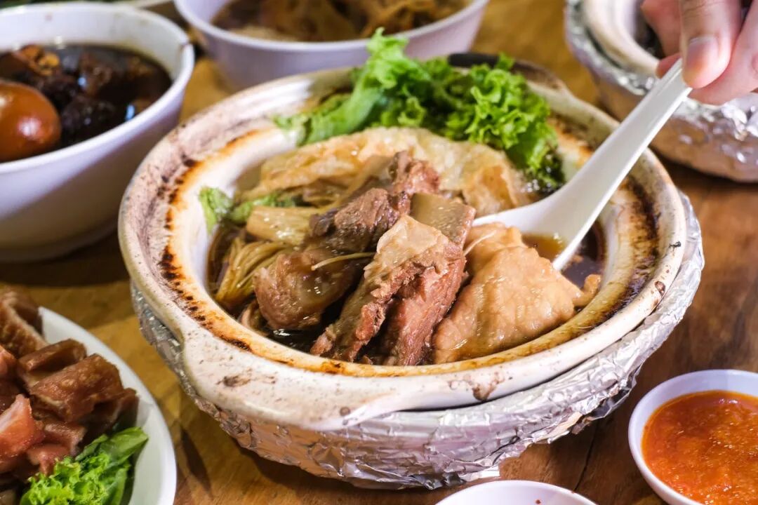 Signature Bak Kut Teh8 新元起,咸甜交织带草本香,多人同行可加 Sesame Oil Chicken(10 新元起)、Braised Pork Trotters(8.50 新元起),猪蹄软糯皮弹,必尝。