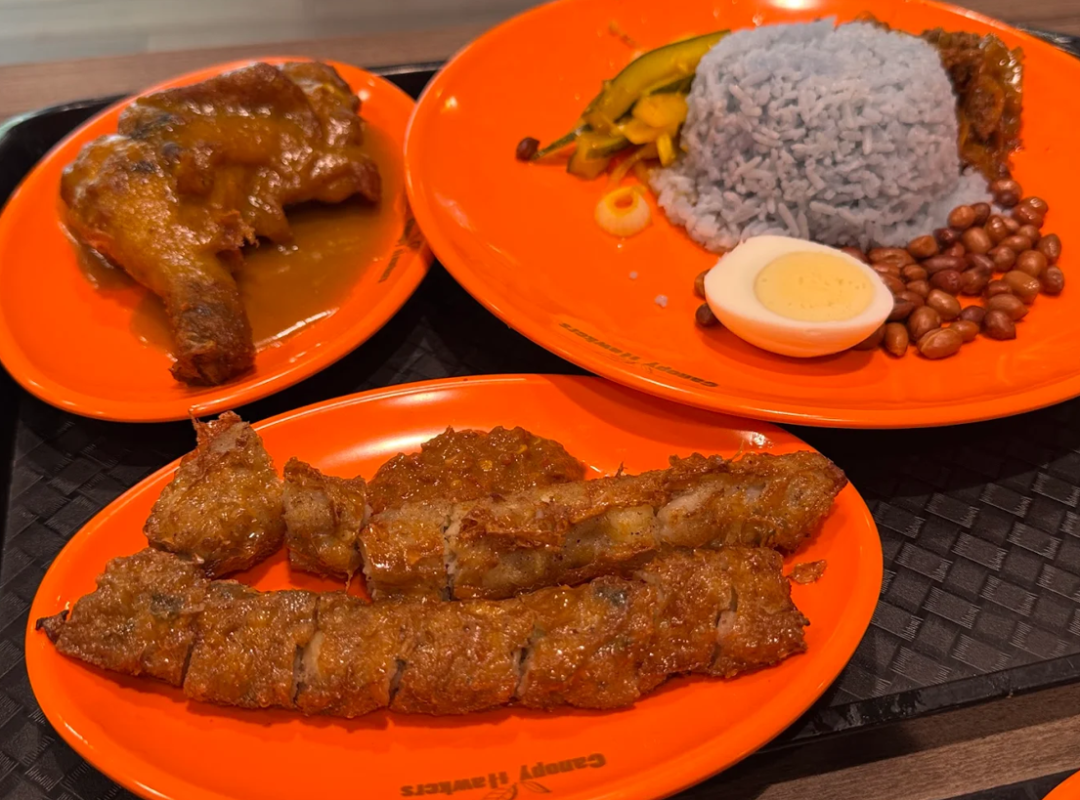 招牌 Chicken Nasi Lemak 售 9.90 新元,椰香米饭搭配香料炸鸡、江鱼仔等,配料丰富,另售 7 新元 5 块装鸡肉拼盘,风味地道。