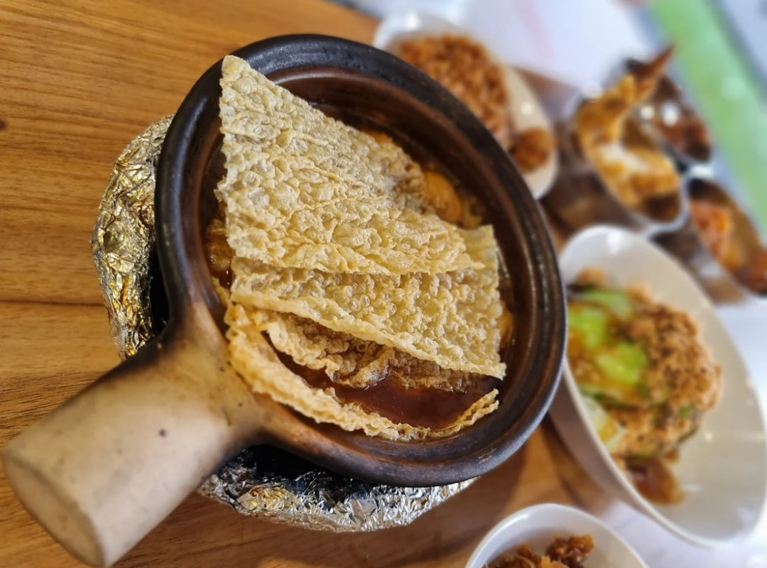 招牌 Special Claypot Bak Koot Teh(10 新元起),瓦煲盛着软烂排骨,配生菜、玉米、蘑菇与腐竹皮,搭配油条(2.50 新元)蘸汤,风味地道。