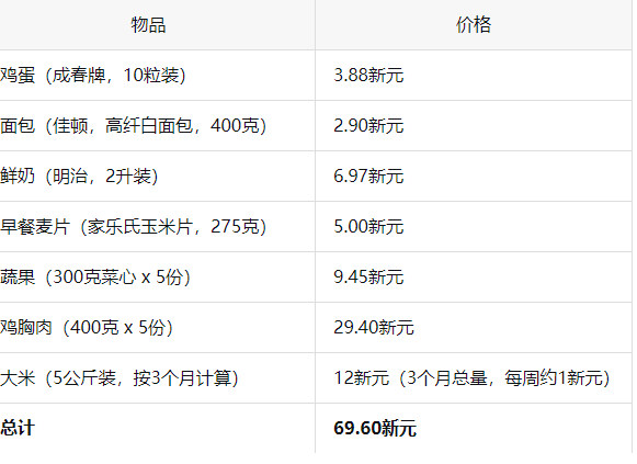 以下是一些常见杂货的周采购价格参考,让你对开销有个概念,如果每天都在加做饭,一个月开销大概为为278.40新币: