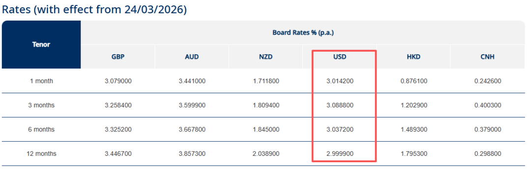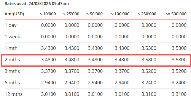 新加坡最大银行——星展银行提供多币种外币定期储蓄,美元定期储蓄的利率比上个月微涨近0.10%,存两个月最高3.58%!(但需存至少25万美元)
