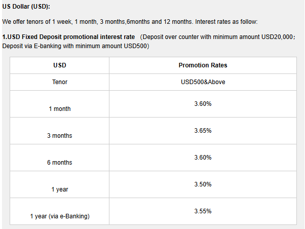 中国银行目前提供的美元定存促销利率有1个月、3个月和6个月和12个月可以选择。最高为存12个月的3.70%,比存新币最高才1.30%的利率香多了!