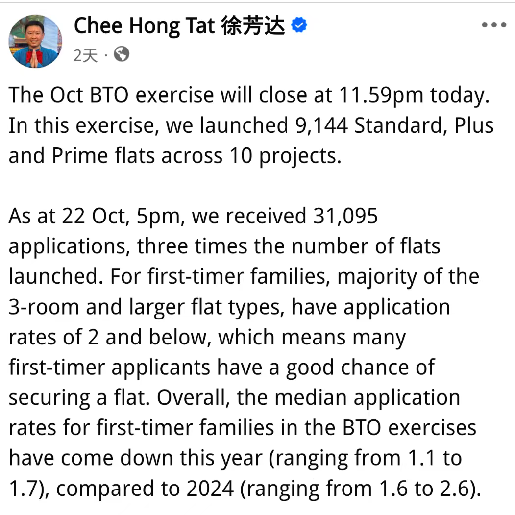 这两天,国家发展部长徐芳达在Facebook上公布了一个好消息:2025年首次申购家庭的中位数申请率已经降到了1.1-1.7之间,这比2024年的1.6-2.6要低不少。说白了,就是首次申购的家庭现在成功的机会比以前更高了!