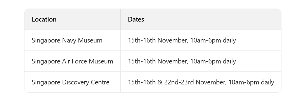 - 2025 年Defence Collective Festival将于 11 月的两个周末举办,Singapore Navy Museum、Singapore Air Force Museum及Singapore Discovery Centre免费开放。