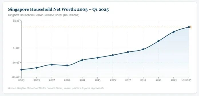 根据新加坡统计局的家庭部门资产负债表,截至2025年第一季度,新加坡家庭总净资产达到3.1万亿新元。