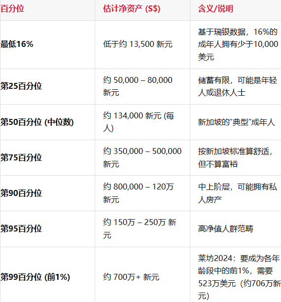 (温馨提示:新加坡没有公开按年龄划分的官方净资产百分位表。新加坡统计局发布收入十分位数据,但不发布财富十分位数据。因此,这些最终是基于现有最佳数据的估算,应视为粗略指南,而非绝对真理)