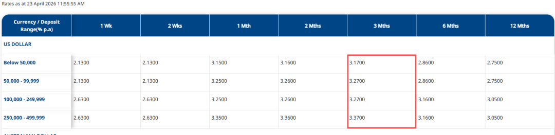 和UOB一样,OCBC华侨银行的美元定存也下降了。