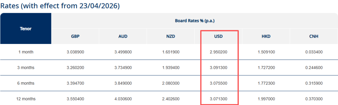 另外,其澳元和英镑的定存利率也相当有吸引力,特别是澳元,存一年有近4.03%的利息可享,如果手中有闲置的澳元可以多关注下~