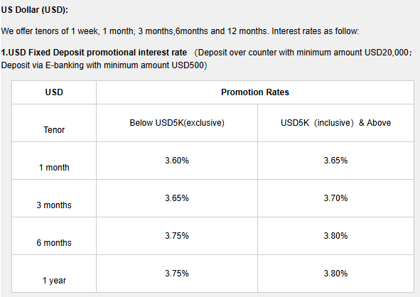 中国银行目前提供的美元定存促销利率有1个月、3个月和6个月和12个月可以选择。最高为存12个月的3.80%,比存新币最高才1.30%的利率香多了!