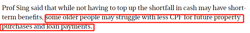 他认为,不必用现金不足CPF短缺,可能会为这些卖房者带来短期利益,但实际上,一些老年人可能会在未来大受影响,为购买房产和偿还贷款的公积金减少而苦苦挣扎。