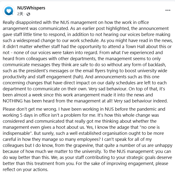 最近,新加坡国立大学(NUS)宣布:所有全职员工,从十月起必须每周五天回办公室工作。