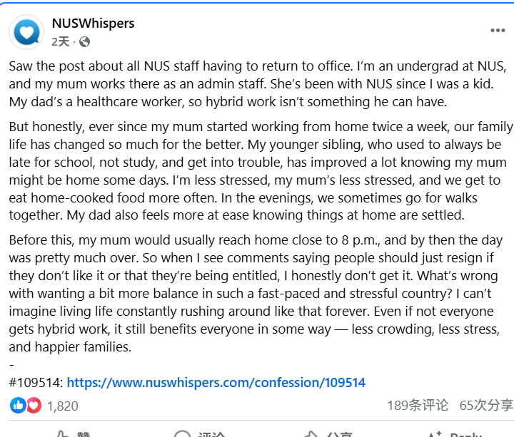 就在宣布后一周,一位NUS员工的女儿——同时也是该校本科生——在“NUSWhispers”匿名发帖,写下了一个普通家庭因为“WFH(居家办公)”而发生的巨大改变。