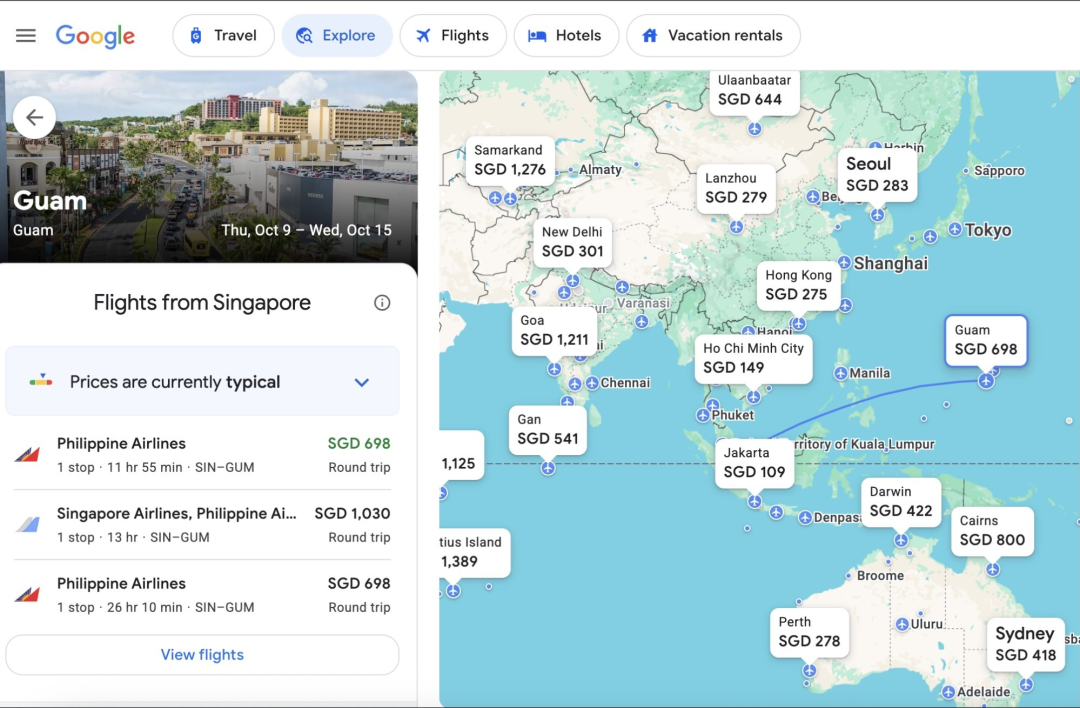 当你移动地图时,它会显示前往其他目的地的最便宜航班。看看下面的地图。你可以看到,飞往珀斯的票价与飞往香港的大致相同,并且比飞往首尔的航班便宜。