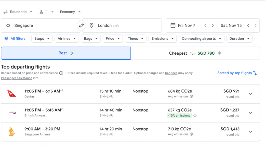 你可以根据是否需要中转或直飞来切换选项。有时一个短暂的中转可以节省数百元;有时则不值得。