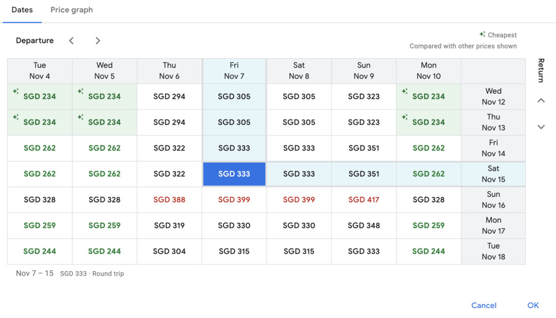如果你的出行日期是可以灵活安排的,日历视图是最强大的功能之一。将行程调整仅仅一两天,你可能会省下很多钱。