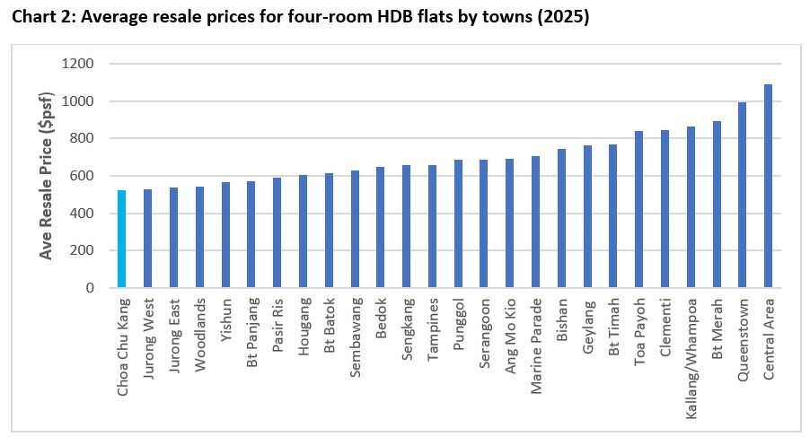 根据今年的平均转售单价,蔡厝港的四房式组屋(523新元/平方英尺)最为经济实惠,其次是裕廊西(529新元/平方英尺)和裕廊东(538新元/平方英尺)。值得注意的是,这三个市镇均位于西部区域,这表明住房预算适中的购房者在找房时或可重点关注西部区域。