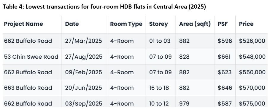 今年迄今,中央区有五套四房式组屋以低于600,000新元的价格售出。其中四套位于Buffalo Road沿线。值得注意的是,Buffalo Road沿线的组屋成交单价在587新元/平方英尺至646新元/平方英尺之间,远低于中央区1,089新元/平方英尺的平均转售单价。