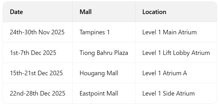 在Tampines 1、Tiong Bahru Plaza、Hougang Mall、Eastpoint Mall的中庭变身全年龄段适配(含轮椅友好)的圣诞主题迷你高尔夫球场,装饰华丽、关卡有趣,LINE FRIENDS 相伴,12:00-20:00 开放。
