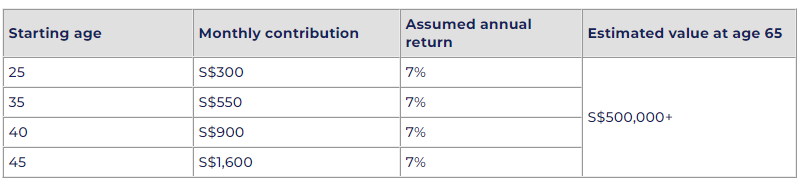 例子:假设年回报率为7%,从25岁起每月投资300新元,到退休时累积金额可能超过50万新元。若从40岁才开始呢?要达到同等金额,每月需投资超过900新元。
