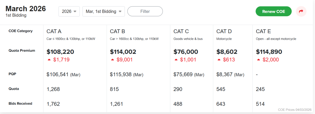 首当其冲的就是拥车证(COE),这是每个人拥有汽车所必需的。而拥车证价格一直居高不下。根据陆路交通管理局(LTA)的数据,在2026年3月4日的投标活动中,A组拥车证成交价为108,220新元,B组为114,002新元。