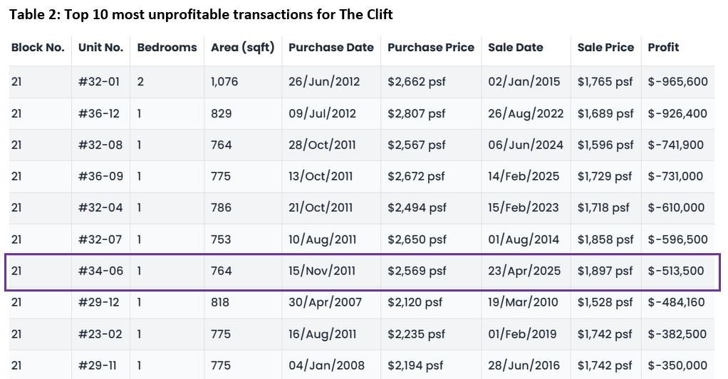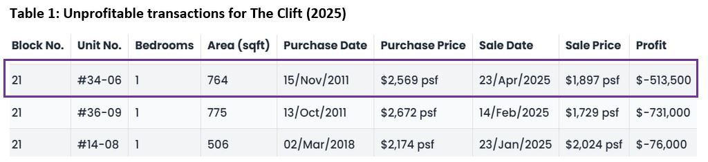 2025年截止到现在,One Shenton的卖家已经完成了5笔无利可图的交易,比The Clift的3笔还多,亏损范围则约为31,000新币至667,000新币。