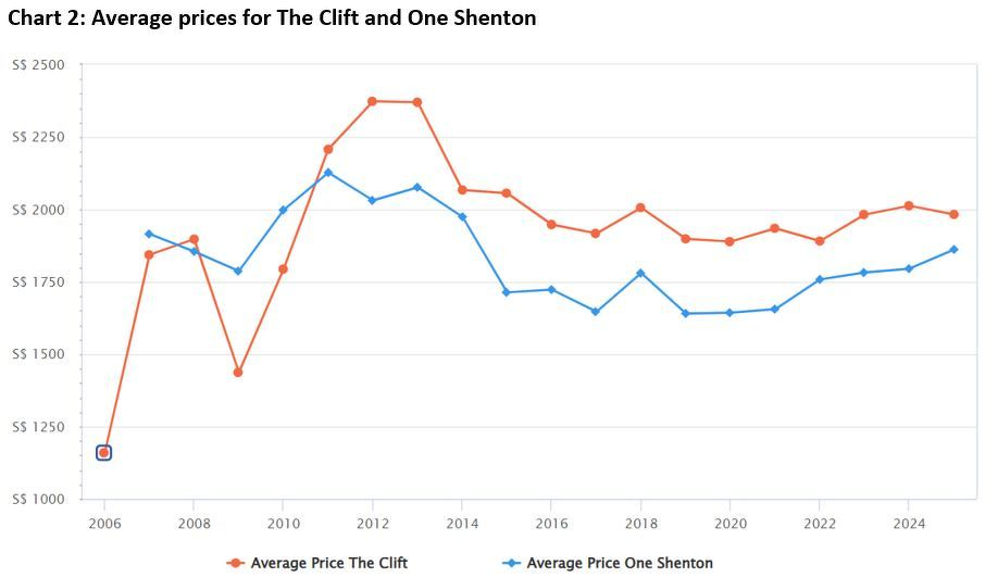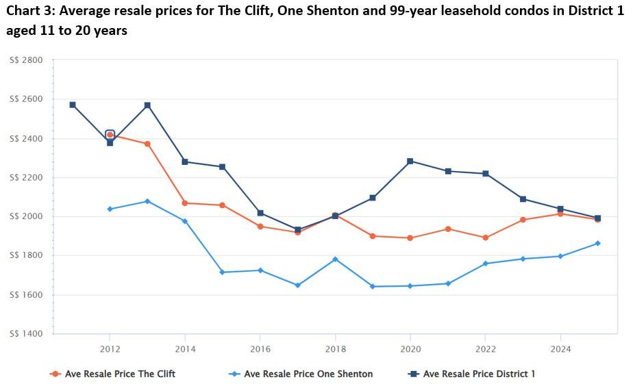 相比之下,The Clift的转售平均价格却是上涨了71.1%。因此,自2011年以来,One Shenton的平均尺价(每平方英尺1,862新币)一直低于The Clift的平均尺价(每平方英尺1,983新币)。