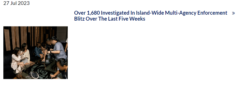 最近,新加坡警察部队发布了一则文告,表示在过去五周,在全岛多处进行了多次突击检查,取得了丰硕成果。