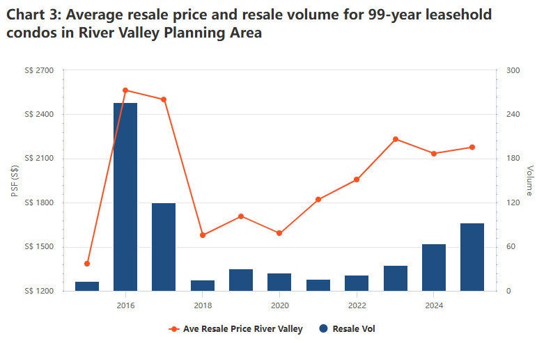 一个事实是:River Valley的新公寓价格已经上涨了很多。从2020年到2025年,99年地契公寓的平均新售价格上涨了20.2%,达到每平方英尺3188新元。另外,公寓交易量也在增加,从2020年的35套增至去年的705套。