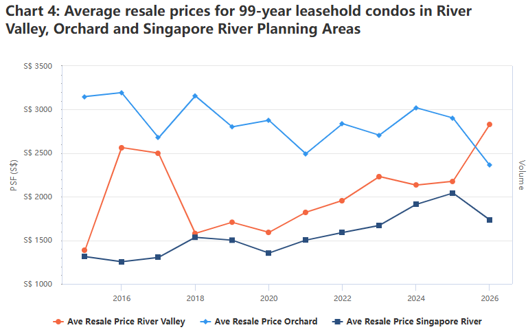 对比99年地契新公寓的价格,去年River Valley此类公寓的平均新售价新加坡河规划区,但低于乌节规划区。