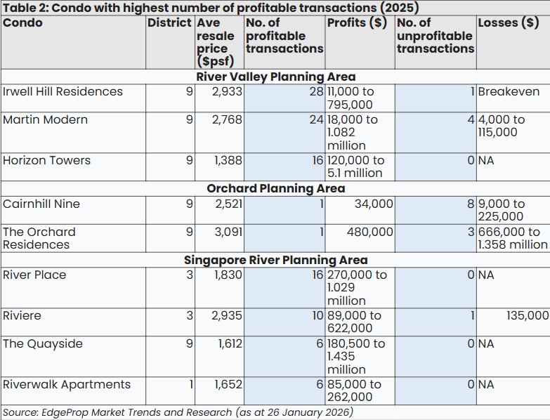 在各规划区平均转售价最高的公寓中,River Valley的公寓去年录得的盈利交易数量超过了乌节区和新加坡河的同类公寓,且是三个区域内唯一出现转售利润超过200万新元的。