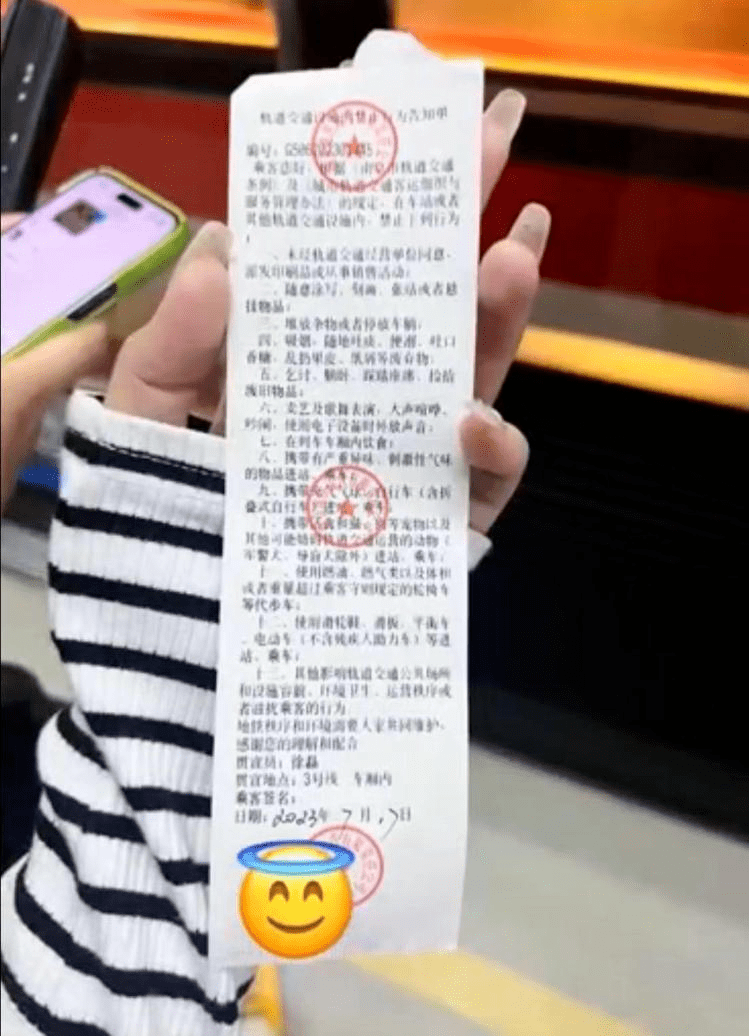 根据女子提供的图片和媒体视频截图来看,7月17日那天,这名女子因为在地铁上喝了瓶装饮料被人发现,于是地铁工作人员对她开了一份“告知单”。也就是所谓的“罚单”。