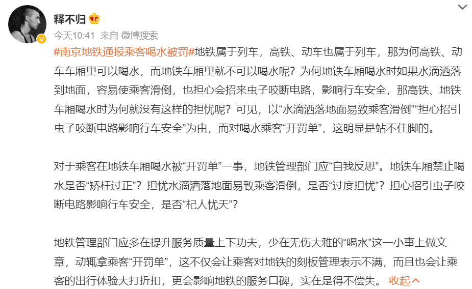 事件虽小,却引来了不少网络大V下场。微博粉丝900多万的大V释不归,写了一段评论表示无法认同有关部门的这个决定,并以“高铁、动车同属列车允许喝水”为由提出疑问。