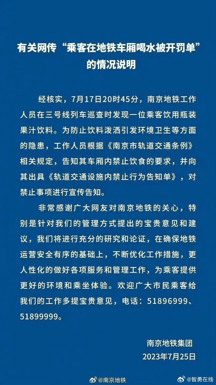 经核实,7月17日20时45分,南京地铁工作人员在三号线列车巡查时发现一位乘客饮用瓶装果汁饮料。为防止饮料泼洒引发环境卫生等方面的隐患,工作人员根据《南京市轨道交通条例》相关规定,告知其车厢内禁止饮食的要求,并向其出具《轨道交通设施内禁止行为告知单》,对禁止事项进行宣传告知。