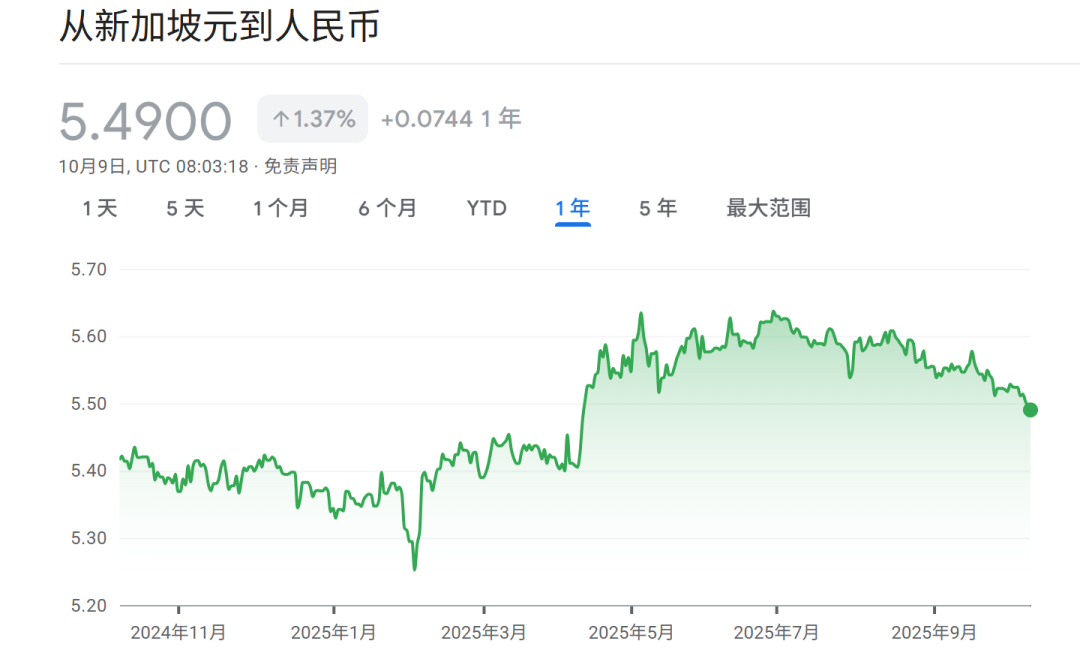 目前汇率大约是 1 新币兑 5.49 人民币。近三个月走势相对平稳,略有下跌。对比去年同期,新币依然保持强势。