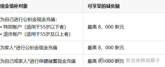 *家人指您的父母、岳父母/家翁家婆、祖父母、配偶的祖父母、配偶或兄弟姐妹。要为向配偶/兄弟姐妹进行的现金充值申请税务减免,收款人必须:(i) 在进行现金填补的前一年,年收入不超过8000新元(包括工资、免税收入如银行利息、股息和养老金),或 (ii) 为残障人士。