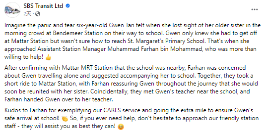 “想象一下,6岁的Gwen Tan早晨在明地迷亚站(Bendemeer Station)的拥挤人群中很姐姐走散。两人原本一起上学,走散后小女孩感到恐慌,她只知道自己必须在玛达站(Mattar Station)下车,但不知道如何到达圣玛格丽特小学。”