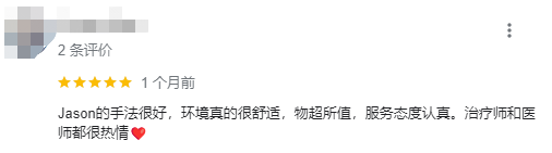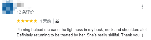 翻译:Jia ning帮我缓解了背部、颈部和肩膀的紧绷感。之后也会回来接受她的治疗。她真的很熟练。谢谢 :)