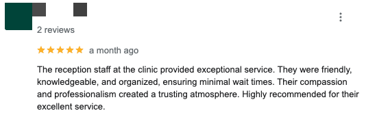 翻译:诊所的接待人员提供了卓越的服务。他们友好、知识渊博、组织严密,缩短了等待时间。他们的同情心和专业精神营造了一种信任的氛围。强烈推荐他们优质的服务。