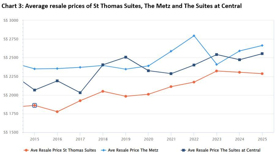 相比之下,圣托马斯大厦在2020年至2025年间实现了最强的价格增长,达13.7%。相比之下,The Metz和The Suites at Central的价格增长分别为11.5%和9.8%。