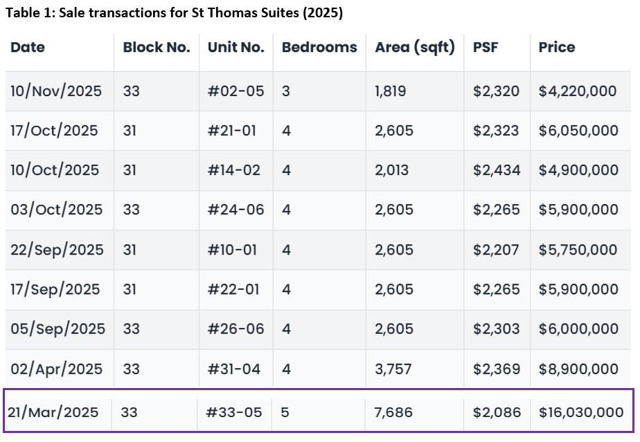 2025年3月,位于St Thomas Suites的一套五卧顶层公寓以1603万新元(每平方英尺2086新元)成交,卖家因此亏损630万新元。
