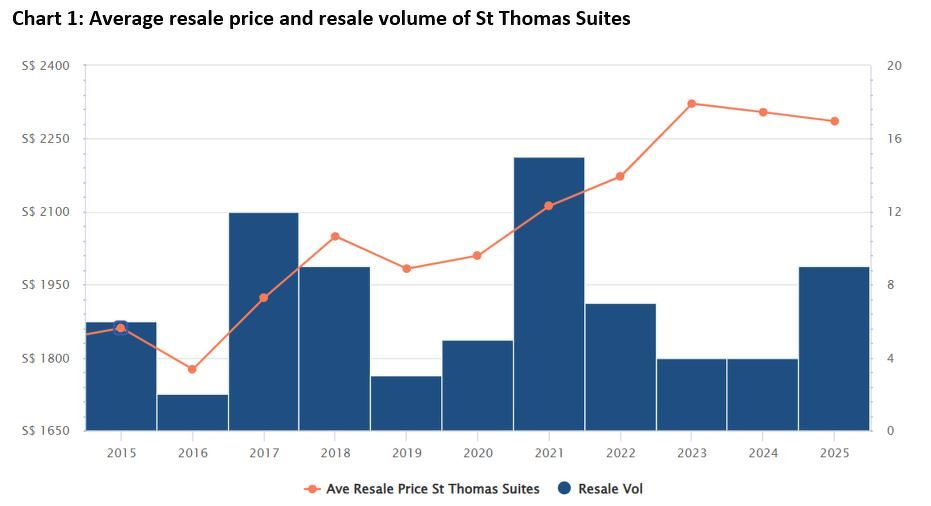 St Thomas Suites的平均转售价格在2020年突破每平方英尺2,000新元大关,此后至去年已上涨13.7%,达到每平方英尺2,286新元。