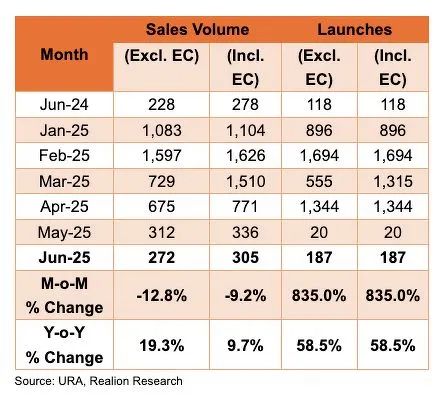 根据市建局7月15日公布的数据,2025年6月新加坡新私宅(不含EC)销售仅272套,环比下降12.8%。虽然同比增长了19.3%,但依然反映出市场在6月学校假期期间的冷清氛围。