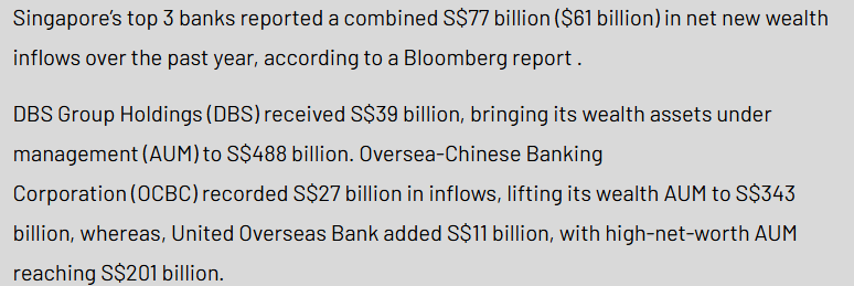 就在前几天,彭博社爆出一个惊人数字:2025年一年,新加坡三大银行(星展、大华、华侨)从亚洲其他地区的超高净值人士手中,吸纳了整整770亿新元的“新钱”!