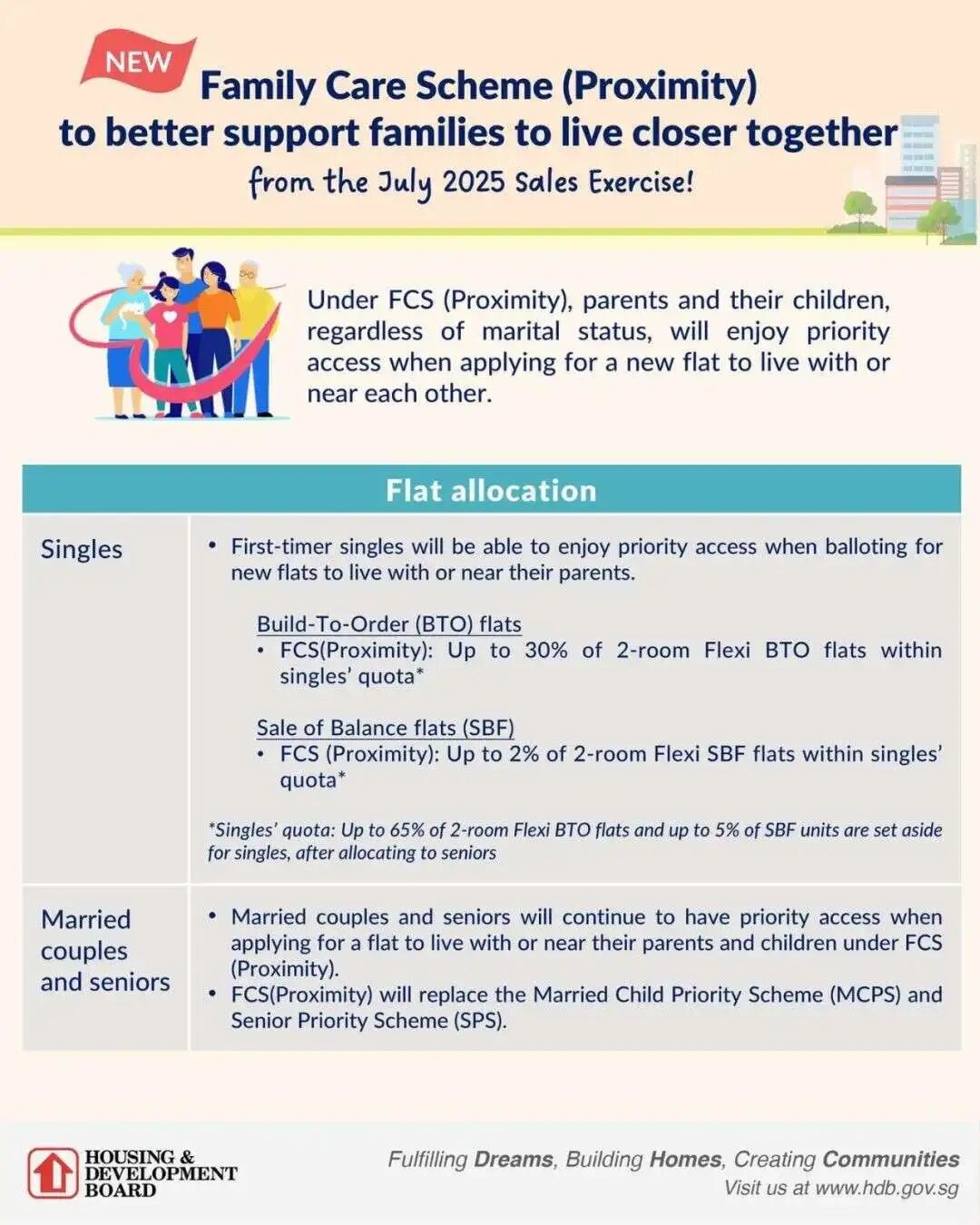 不仅如此,从今年7月开始,还有一个针对单身人士的 “家庭互助优先计划” 要生效了。如果你愿意买在和父母同一个小区或者父母家附近,那么在申请二房式灵活组屋时,你将享受优先权!原本留给单身人士的65%配额里,最多有30%会优先给这些“孝顺的孩子”。