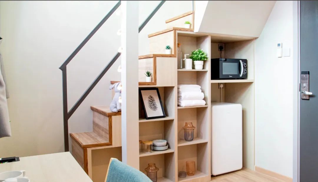 小厨房超实用:电磁炉、炉灶、微波炉、迷你冰箱、餐具一应俱全
