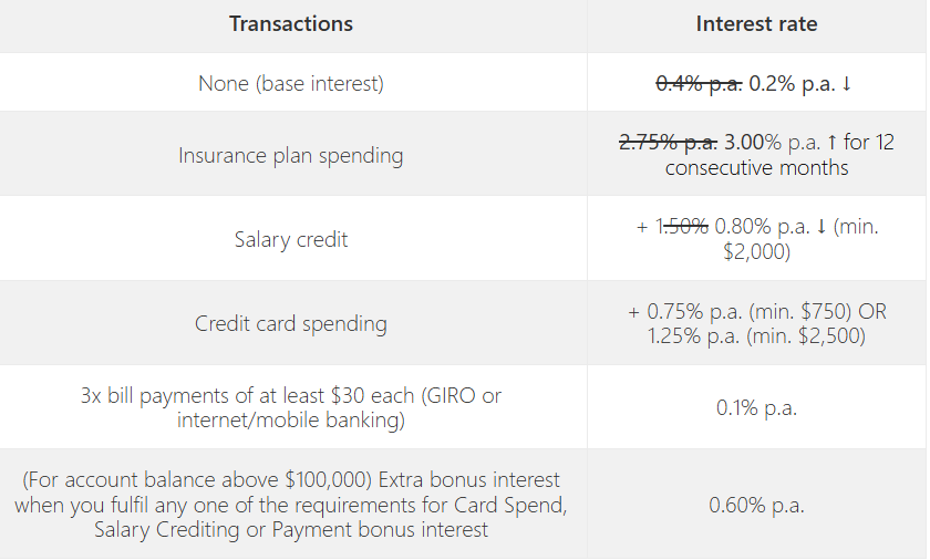 开户并将你的工资(最低2000新币)存入该账户,现在只能获得0.80%的年利率。这比之前高峰的2.5%降了不少,比上个月的1.50%也近乎砍半。