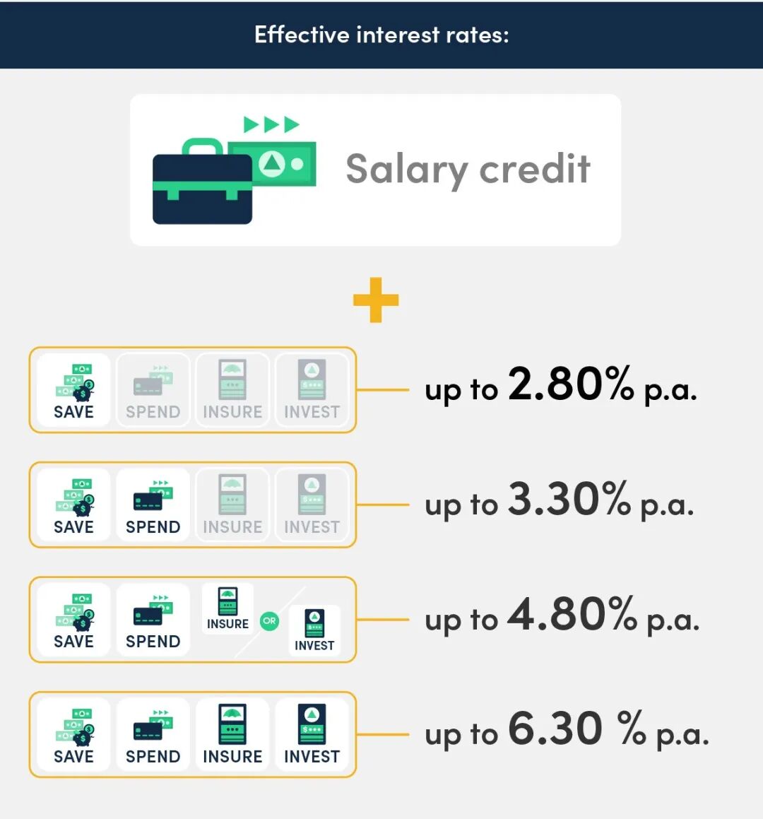 只有当你满足所有4个要求:把你的工资存起来,用信用卡消费,投资,买保险,才能解锁全额利率: