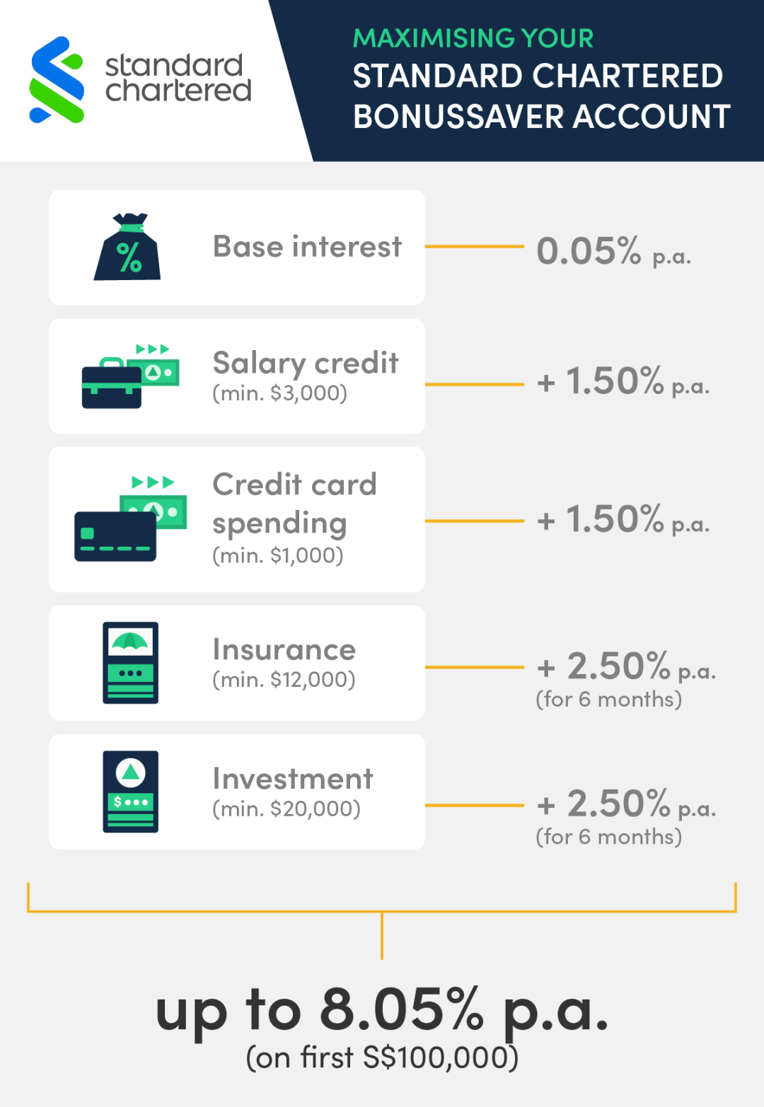 ③购买保险(+1.5%),每月购买一份或多份新的单期保费保单,总金额至少为50000新币,且不是用CPF或退休辅助计划SRS购买的保单