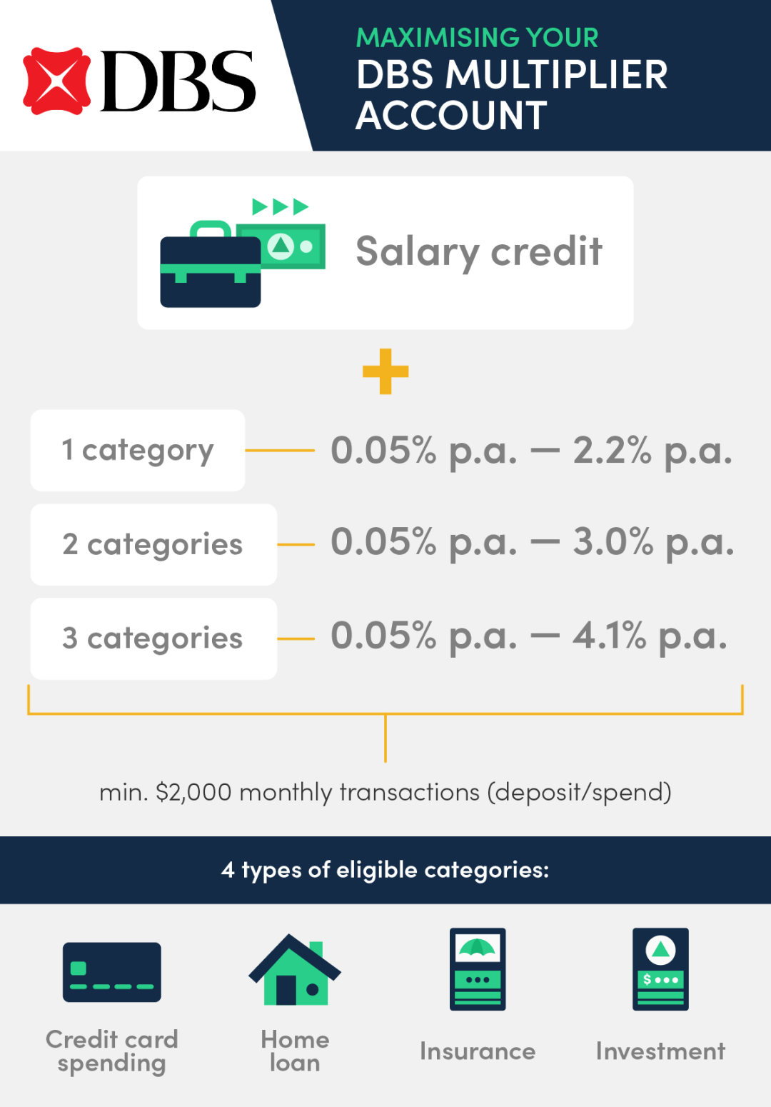 好消息是,不管是将工资存入任意的DBS/POSB户头(不需要是DBS Multiplier户头),或者在指定领域完成消费,加起来每月满足2000新币,就能达到基本条件。